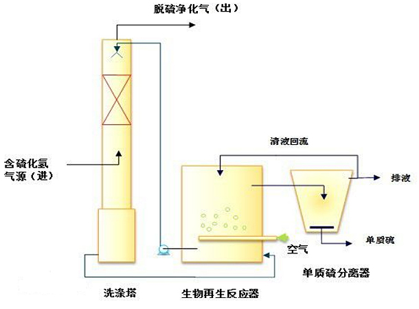 生物脫硫是堿式洗滌塔與生物再生反應(yīng)器的結(jié)合,洗滌塔用來去除氣態(tài)流體中的硫化氫,再生反應(yīng)器中堿得到再生。該脫硫方式采用洗滌塔外加氧曝氣的方式,這種處理后的沼氣中不含空氣中的氮?dú)?、氧氣。硫化物在再生器?nèi)完成被氧化的過程,使液態(tài)硫化物轉(zhuǎn)化成硫單質(zhì),形成硫泥。通過曝氣、加熱、加營養(yǎng)鹽、加堿等手段,保持循環(huán)液的主要技術(shù)參數(shù),給脫硫微生物創(chuàng)造穩(wěn)定、適宜的生存環(huán)境,確保了堿液回收和洗滌塔的脫硫效果。